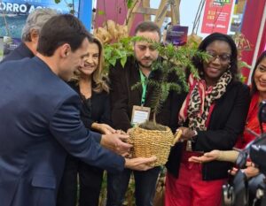Eduardo Zorzanello e Marta Rossi entregam a muda de araucária à representante da Costa Rica/foto: Júlio Zaruch