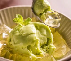 Uma das sobremesas: sorvete artesanal de maçã verde levemente ácido e cremoso servido sobre gelatina de saquê