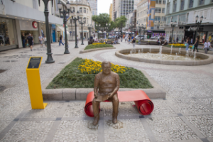Escultura de Jaime Lerner, obra de Elvo Benito Damo, nova atração do calçadão da rua das Flores, em Curitiba/foto: Isabella Mayer/Secom