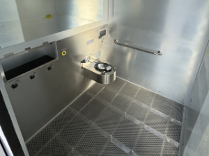 A abertura e travamento da porta são automatizados. Para sair, basta que a pessoa aproxime sua mão do sensor verde ao lado da porta. O papel higiênico deve ser descartado dentro do vaso sanitário e a descarga é acionada automaticamente após o uso.