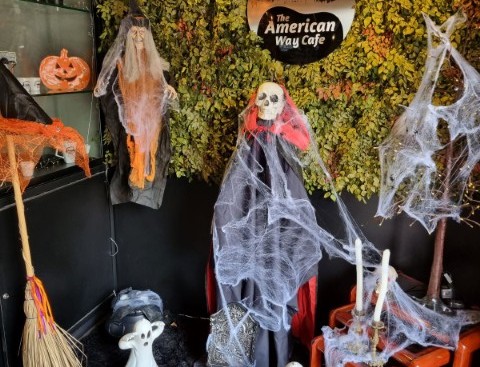 Neste outubro, o American Way Café, de estilo norte-americano, troca as cores tradicionais (vermelho e azul) pelas preto e laranja para saudar o Halloween, “com imagens para fazer o cliente